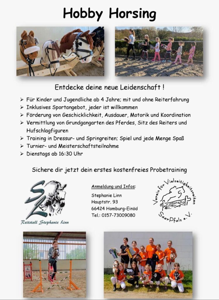 Auf unserer Reitanlage startete das Hobby Horsing bereits im Jahr 2020. Als erster Verein im Saarland haben wir diese spannende Sportart vorangebracht und erfreuen uns nach wie vor über einen stetigen Zuwachs an Teilnehmer*innen in unserem Hobby Horse Team.